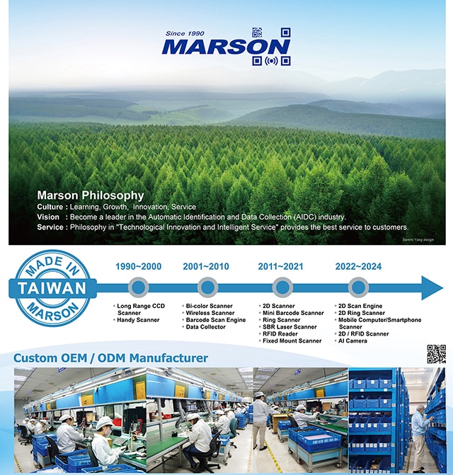 Marson is a specialized manufacturer of Barcode Scanners, Scan engines & RFID Readers in Taiwan, and Barcode Scanning Solutions of AIDC providing OEM / ODM custom services.